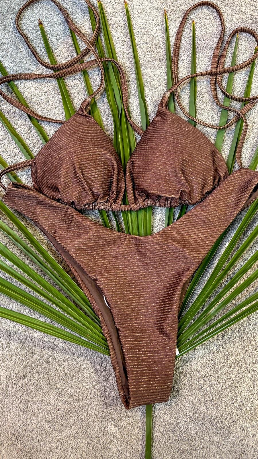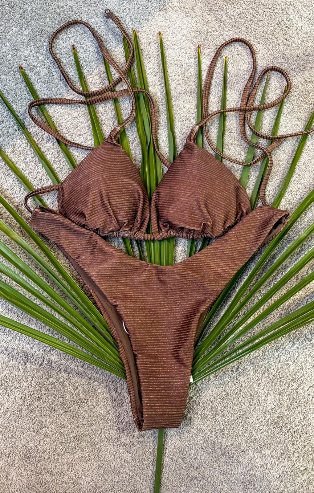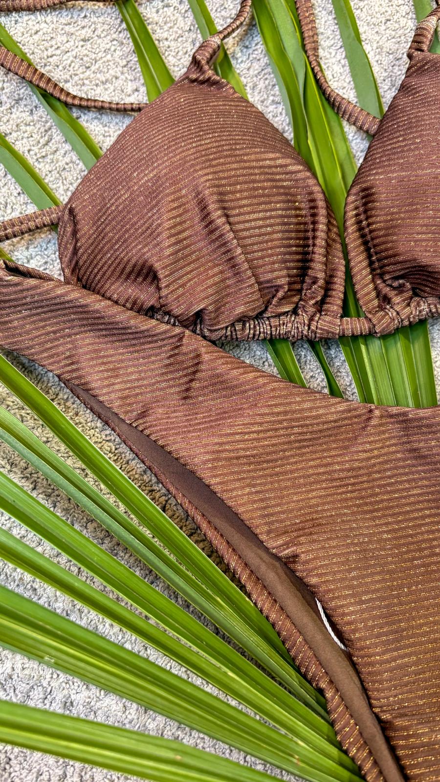 Il modello Mina di Matinée unisce un top a triangolo regolabile, con coppe estraibili, a uno slip brasiliana con scollo a V che valorizza e slancia la silhouette. Il tessuto a costina lurex dona profondità e luce al marrone, creando un effetto caldo e raffinato sulla pelle.