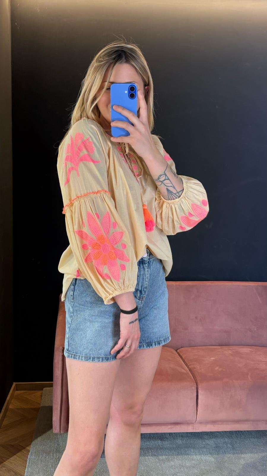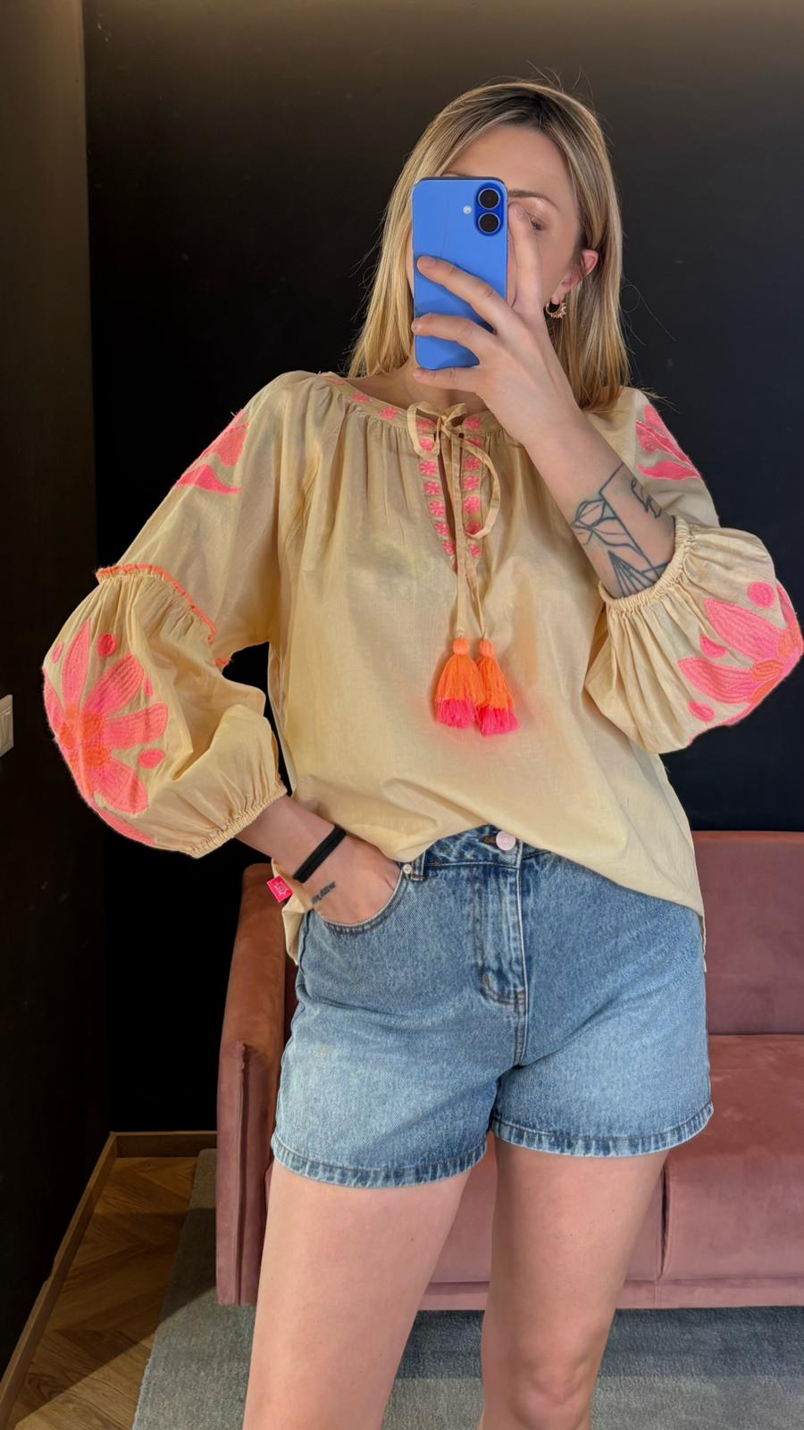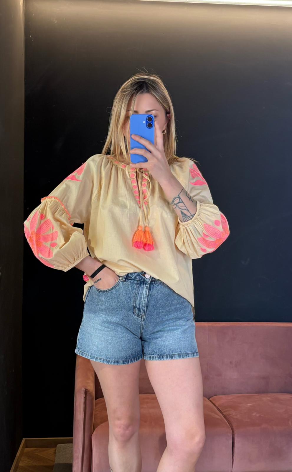 Realizzata in cotone leggero e traspirante, si distingue per la sua tonalità neutra e calda, un beige dorato che illumina naturalmente l’incarnato. I ricami nei toni del rosa e dell’arancio creano un contrasto morbido e femminile, aggiungendo carattere senza risultare eccessivi.