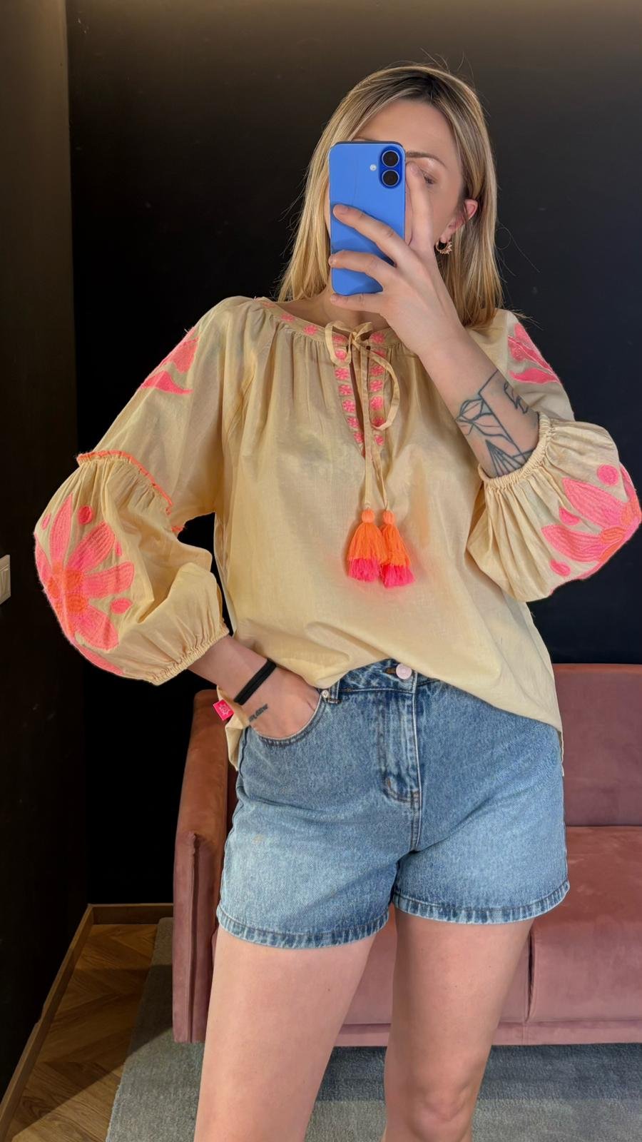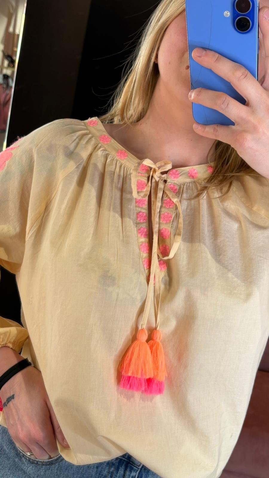 Le maniche a palloncino donano volume e leggerezza, mentre lo scollo con laccetto e nappine completa il capo con un tocco delicato e rilassato.