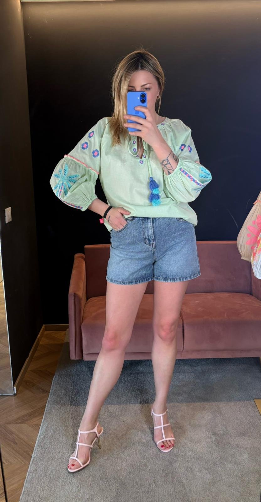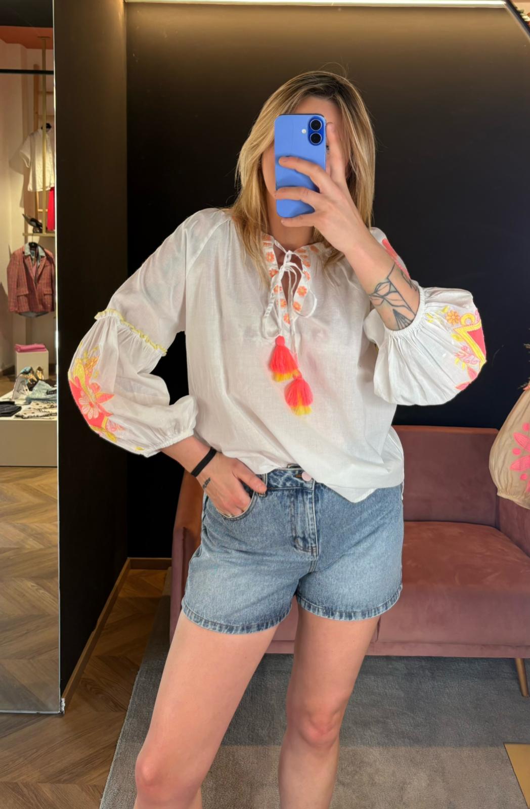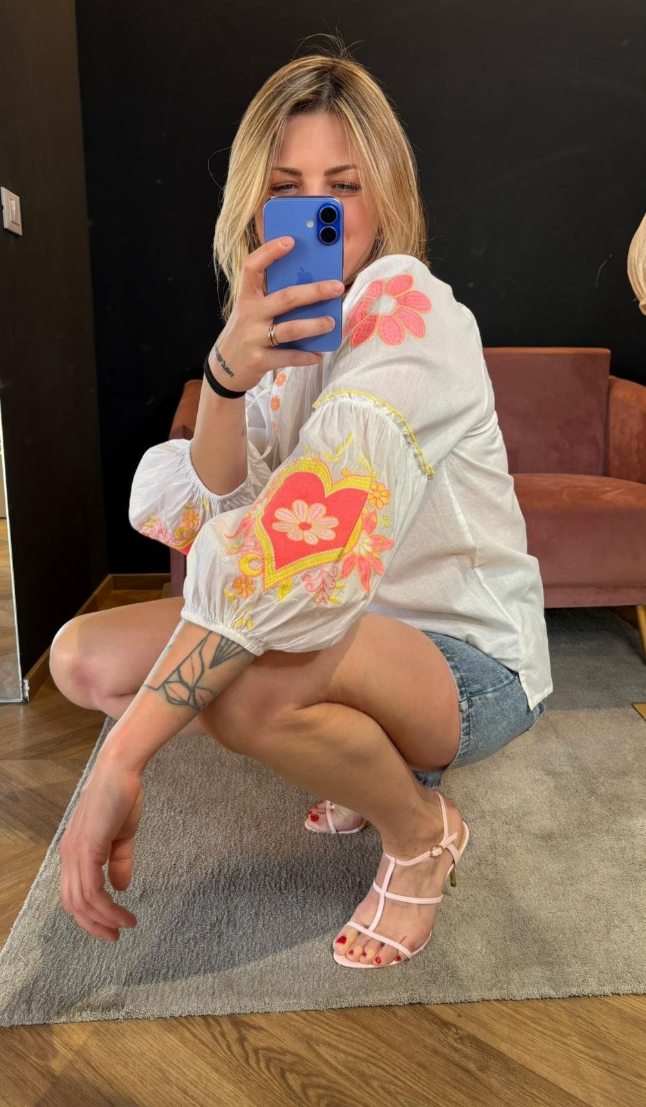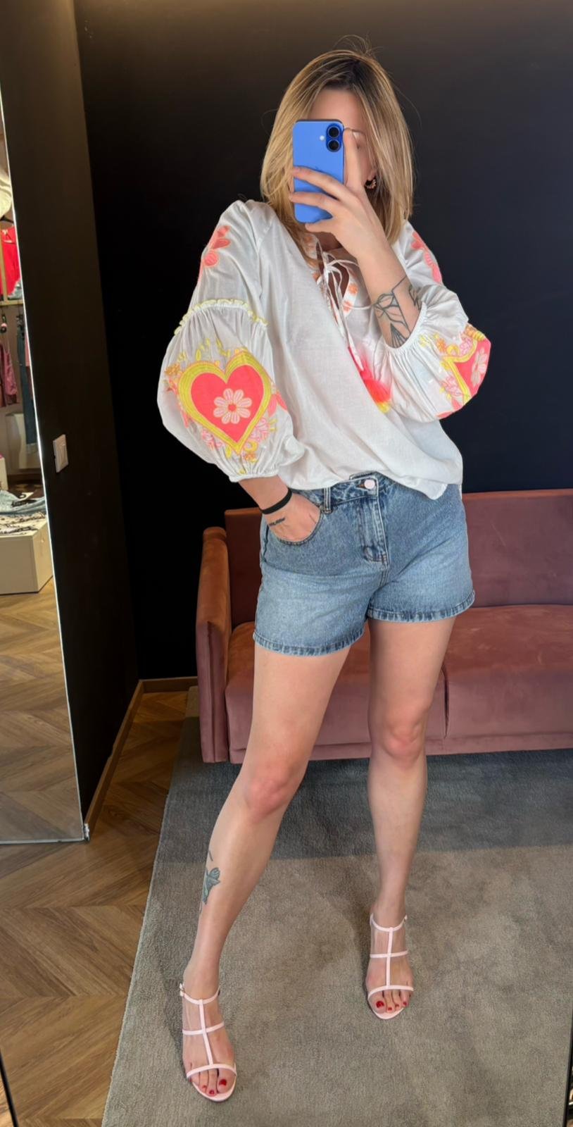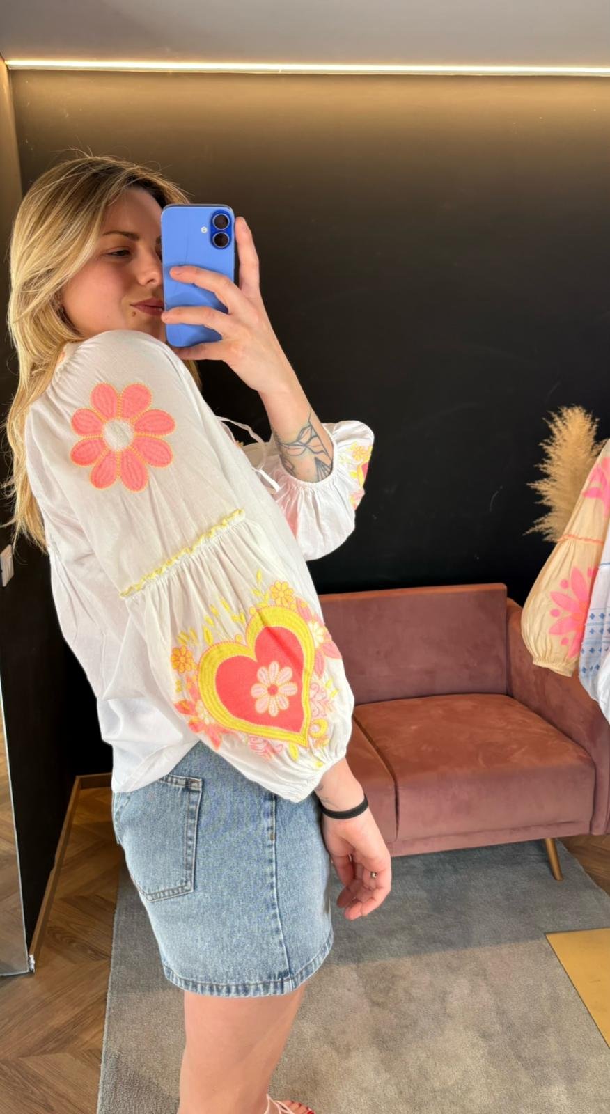 Realizzata in cotone leggero e impalpabile, è arricchita da ricami vivaci e dettagli unici che raccontano un’estetica romantica e contemporanea allo stesso tempo. I cuori e i fiori ricamati sulle maniche donano carattere e personalità, trasformando una blusa apparentemente semplice in un pezzo speciale.