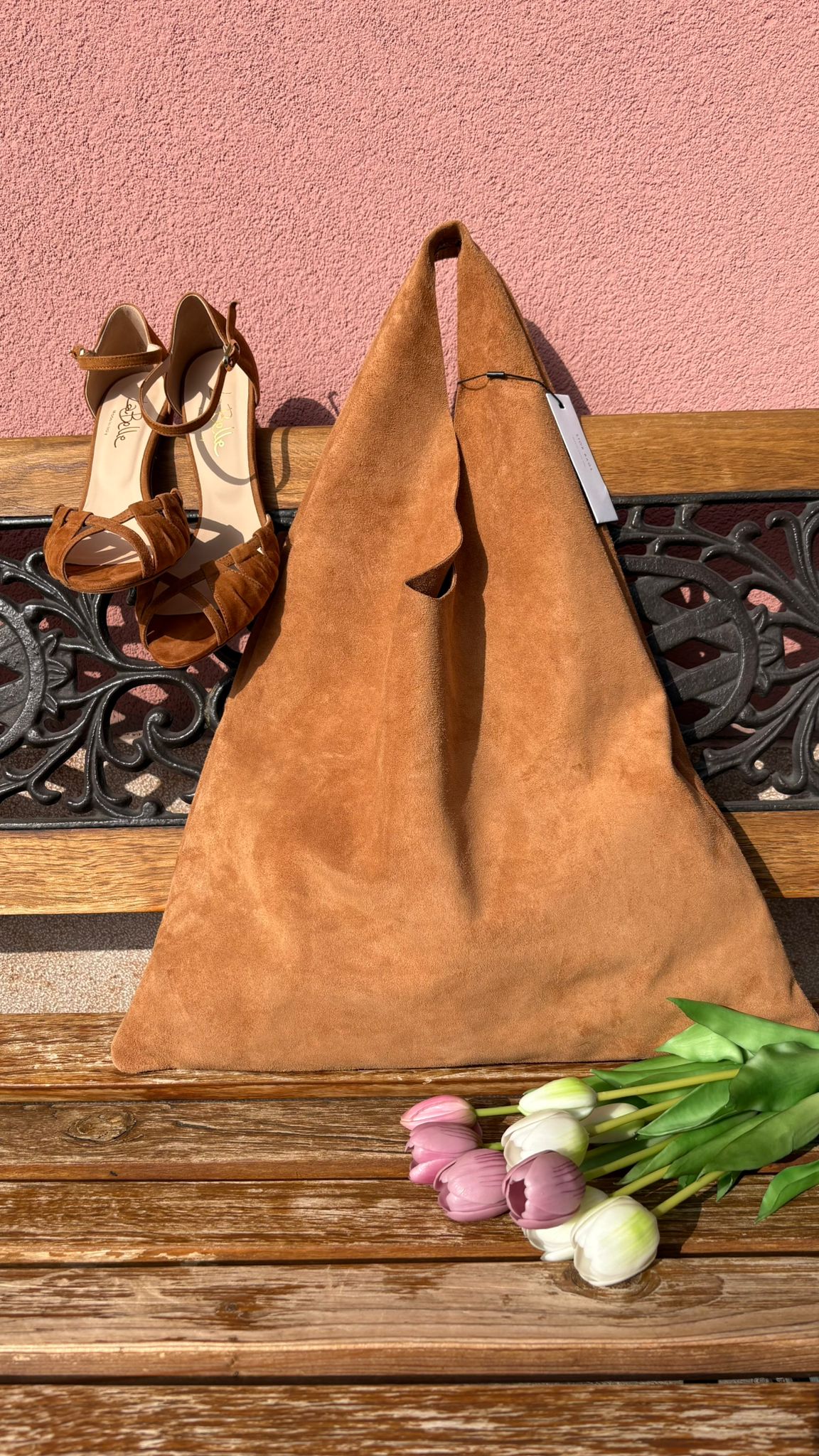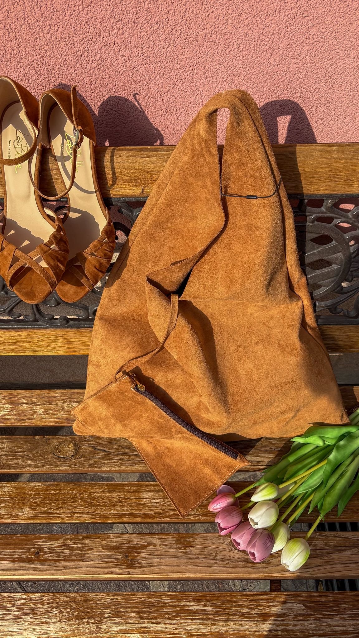 Realizzata in morbido suede, si distingue per la sua texture vellutata e per il design minimal con manico integrato che la rende pratica e confortevole da portare a spalla.