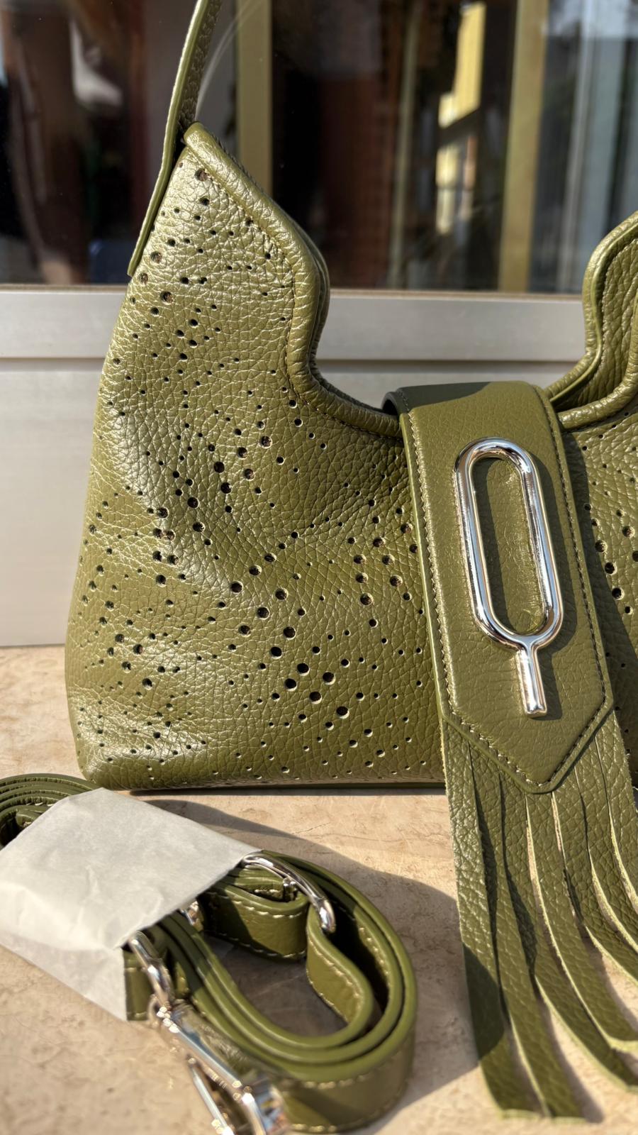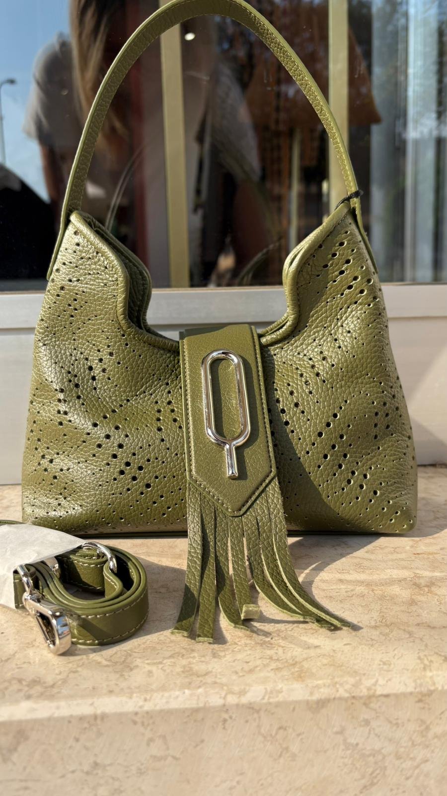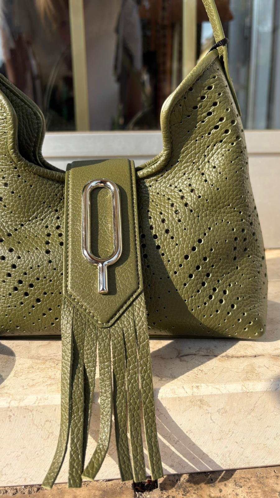 Borsa in Vera Pelle Traforata Verde Oliva con Frange – Made in Italy - Verde