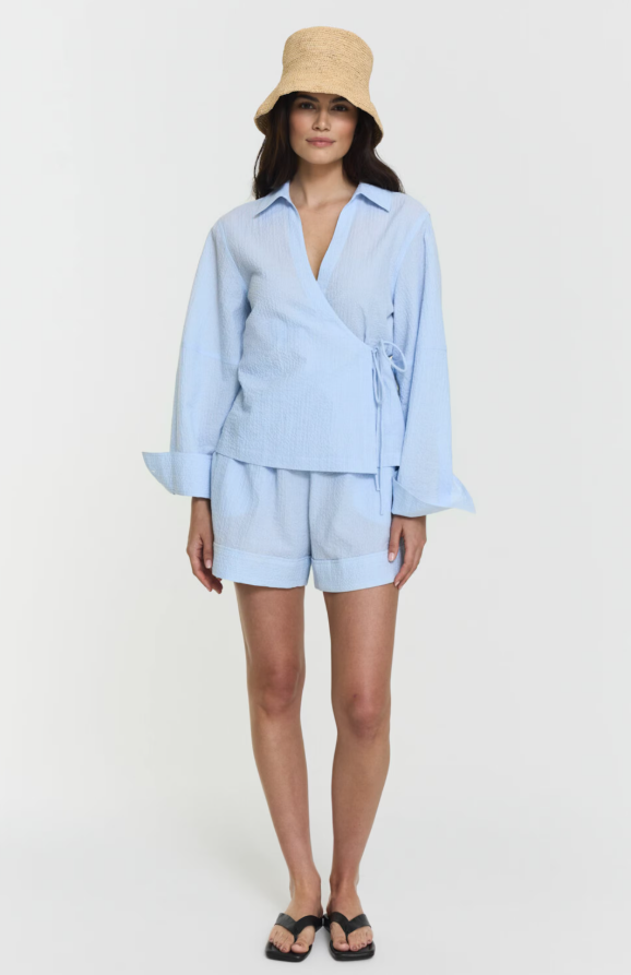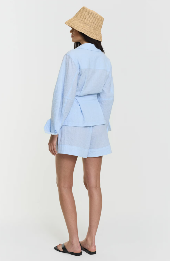 La delicata fantasia a righe azzurro chiaro dona freschezza e luminosità, rendendola perfetta sia con pantaloni sartoriali che con shorts coordinati per un look contemporaneo e sofisticato.