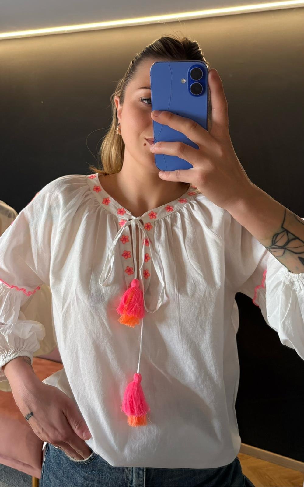 Il punto focale è lo scollo arricchito da piccoli fiorellini ricamati e nappine decorative, che aggiungono un tocco giocoso e femminile.