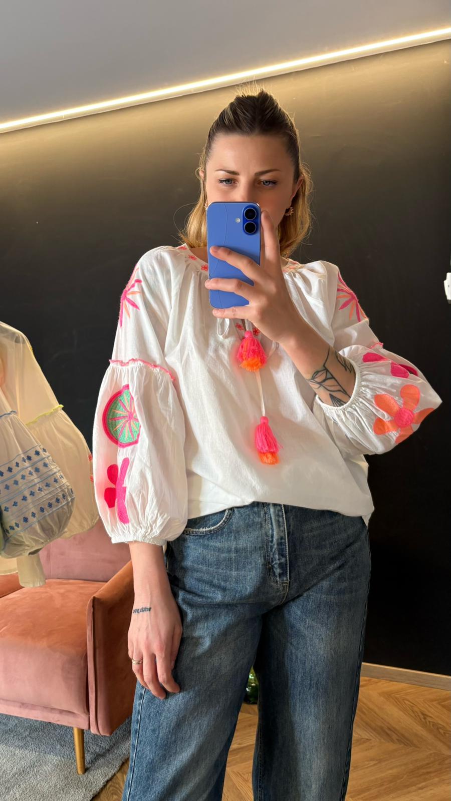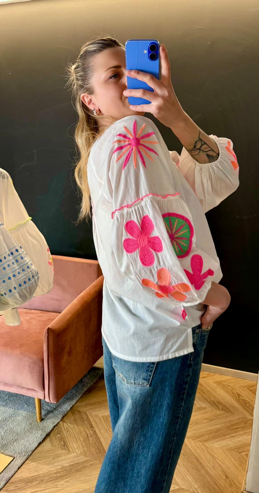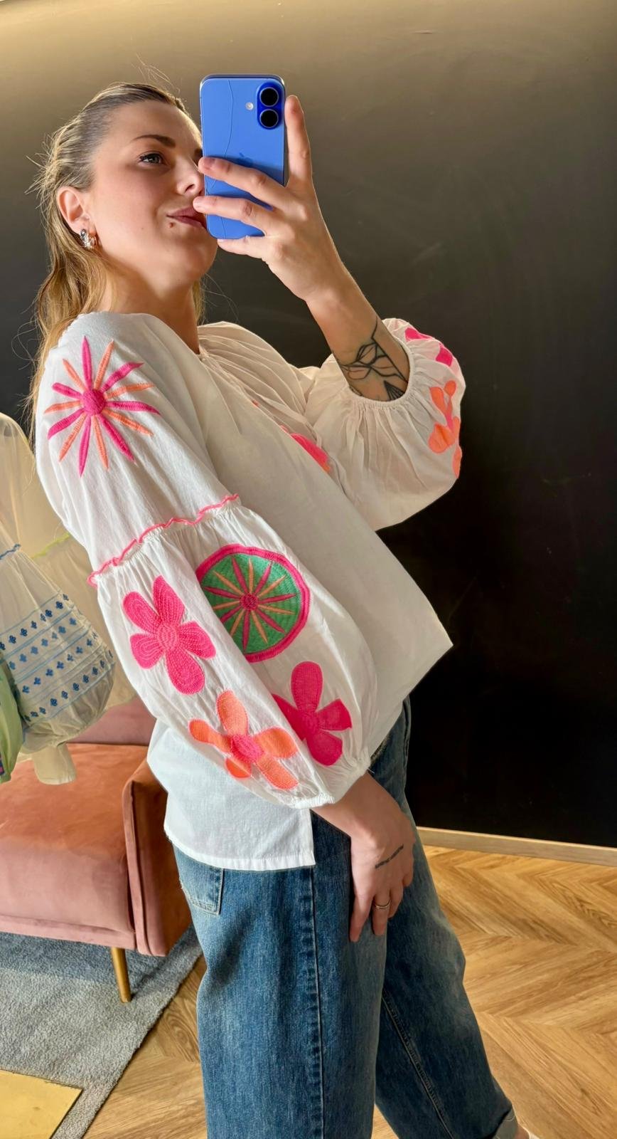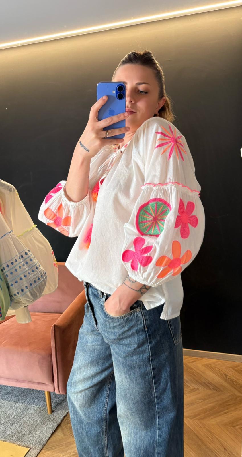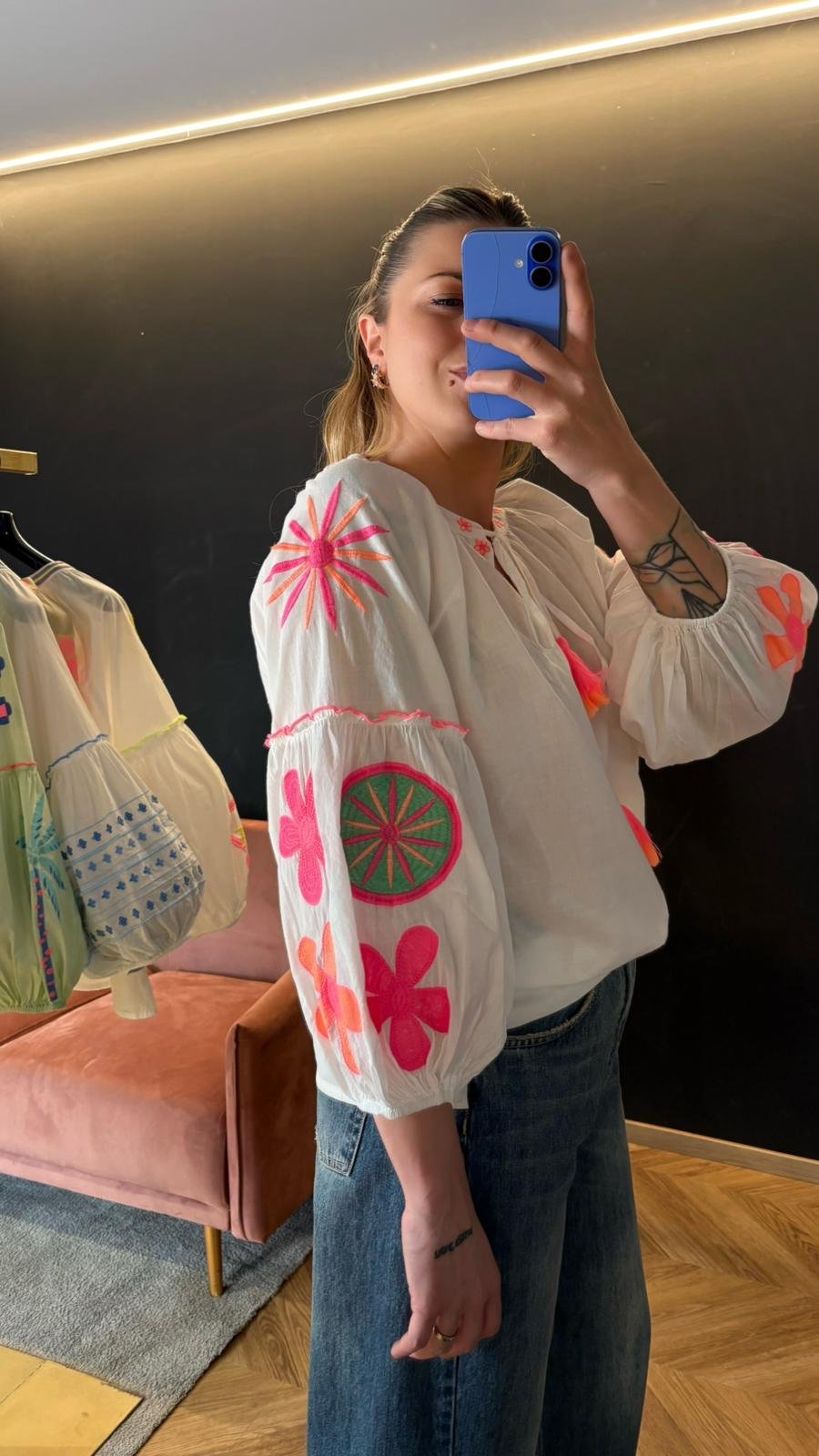 Realizzata in 100% cotone leggero, questa camicia firmata Tartaruga conquista per i suoi ricami vivaci e colorati, ispirati a un’estetica boho contemporanea. Le maniche a palloncino a tre quarti creano volume e movimento, mentre i dettagli floreali ricamati donano carattere e unicità al capo.