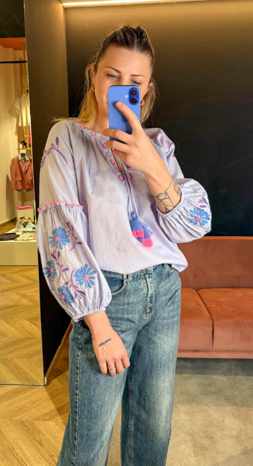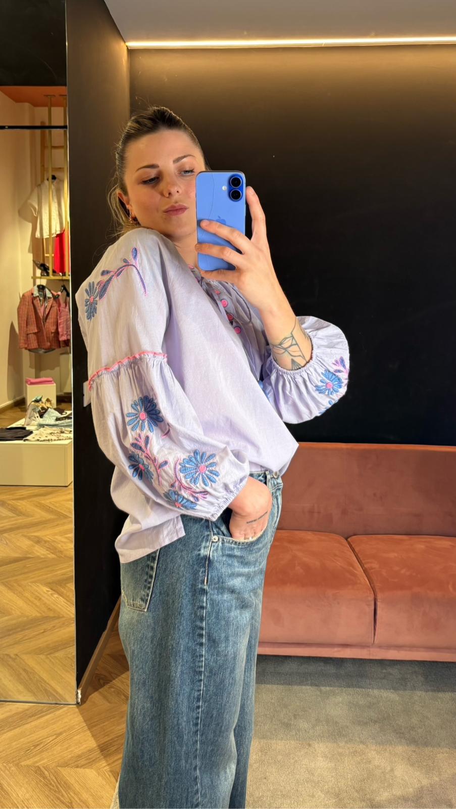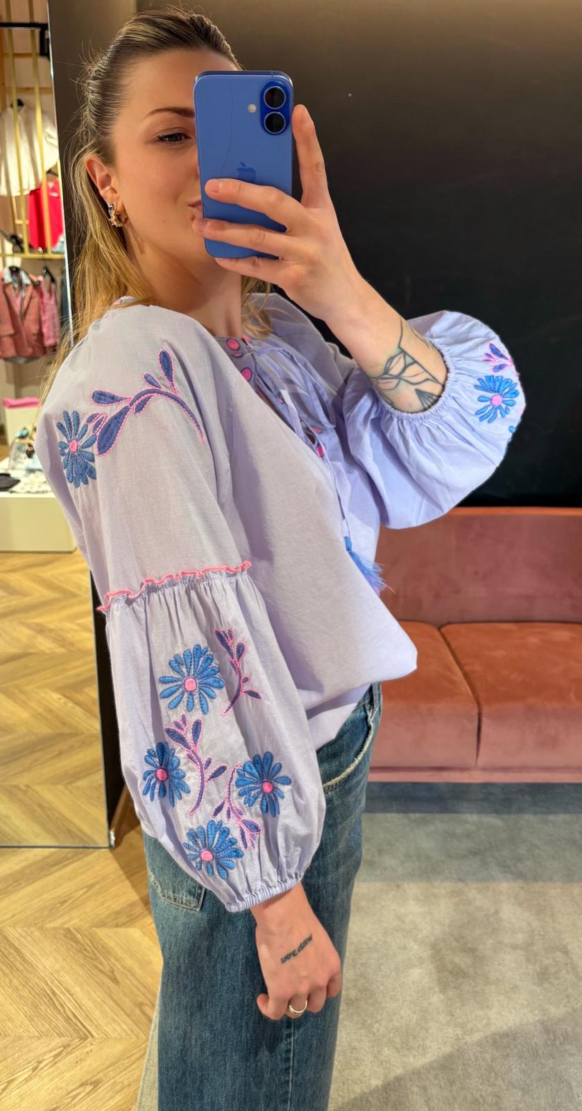 Camicia Ricamata Floret Blues Lilla – Manica Balloon