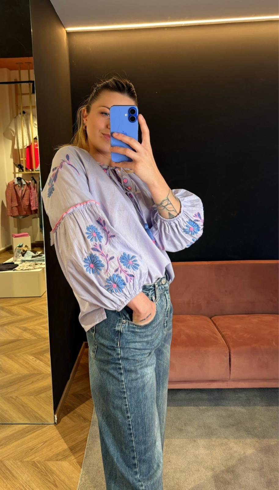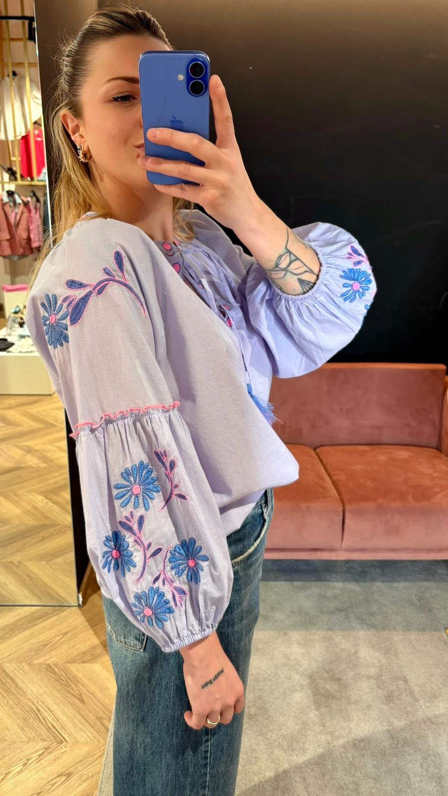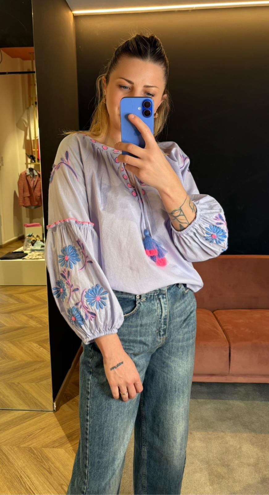 Camicia Ricamata Floret Blues Lilla – Manica Balloon