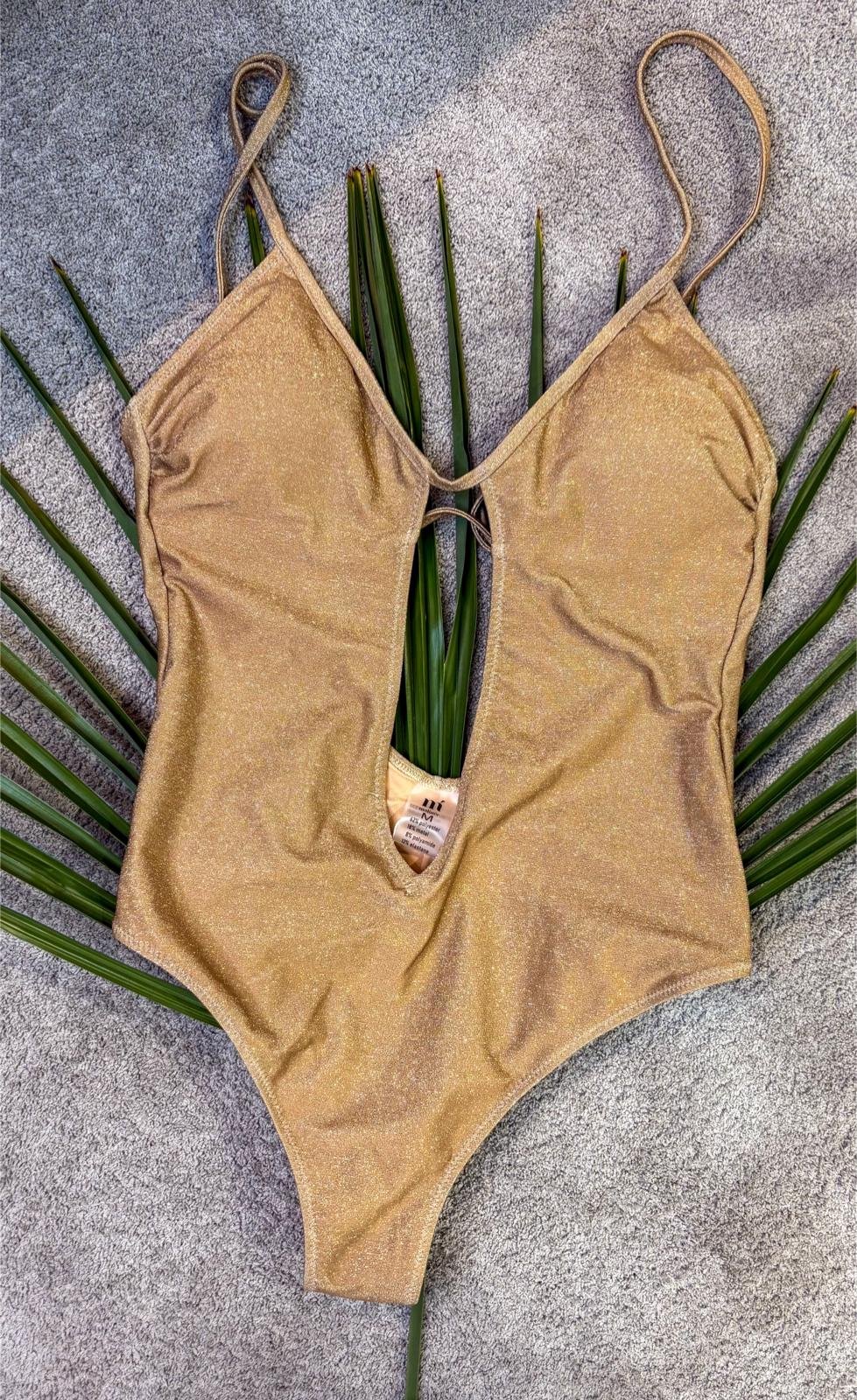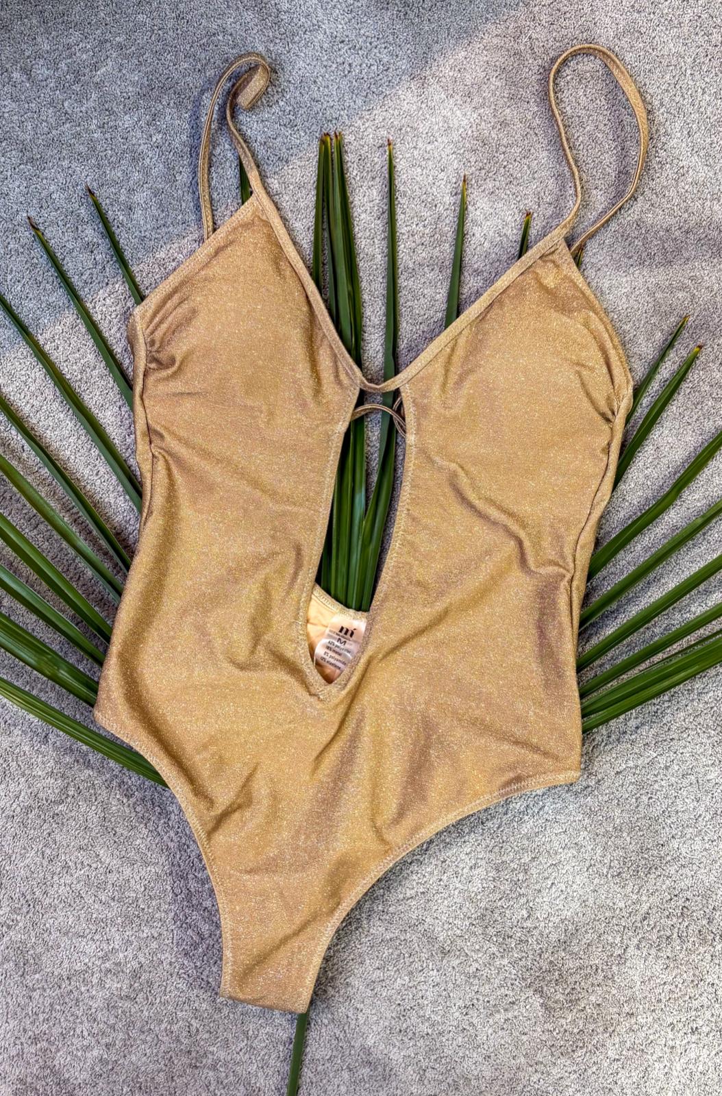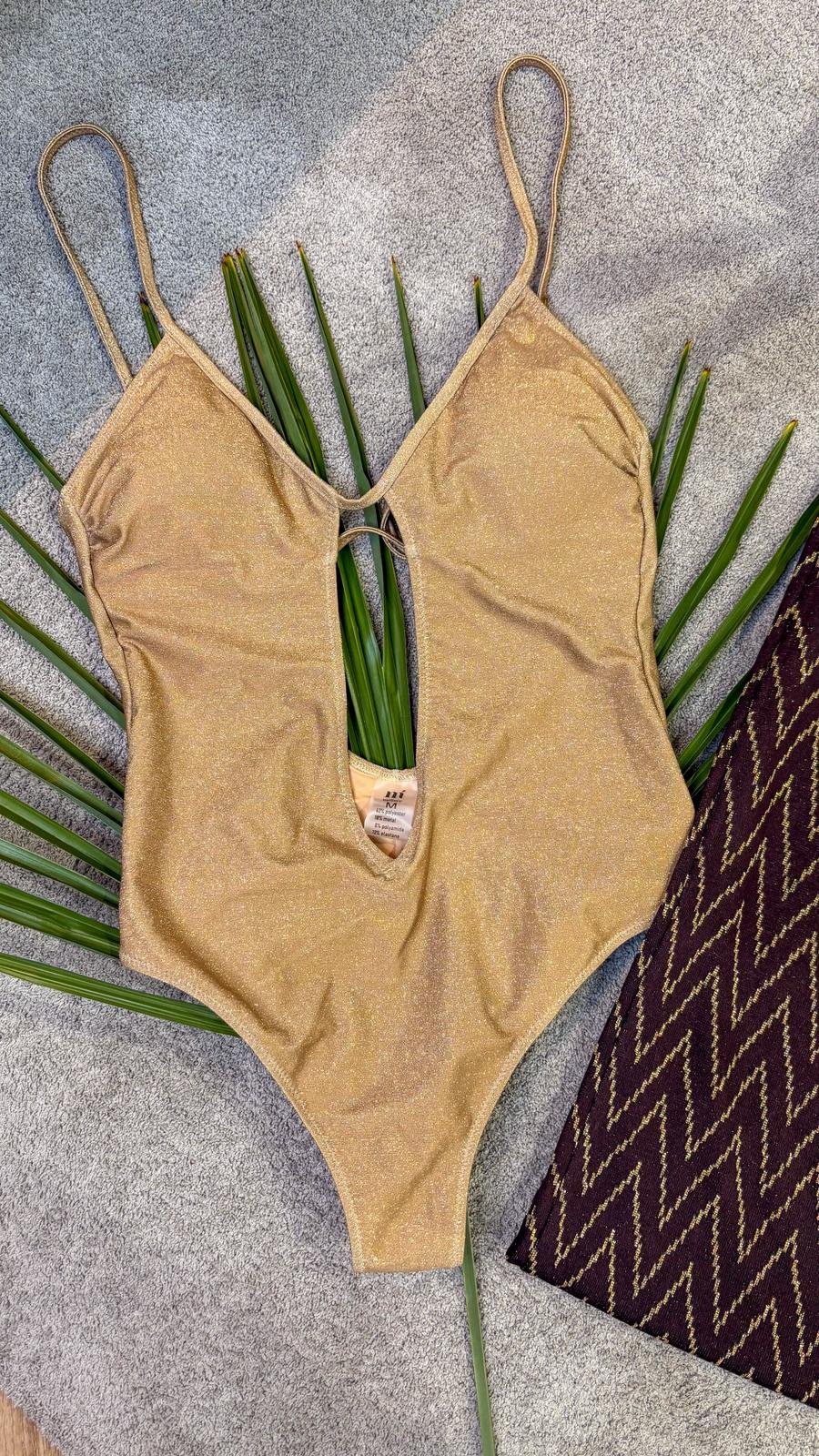 Costume intero oro lurex con scollo profondo e apertura centrale