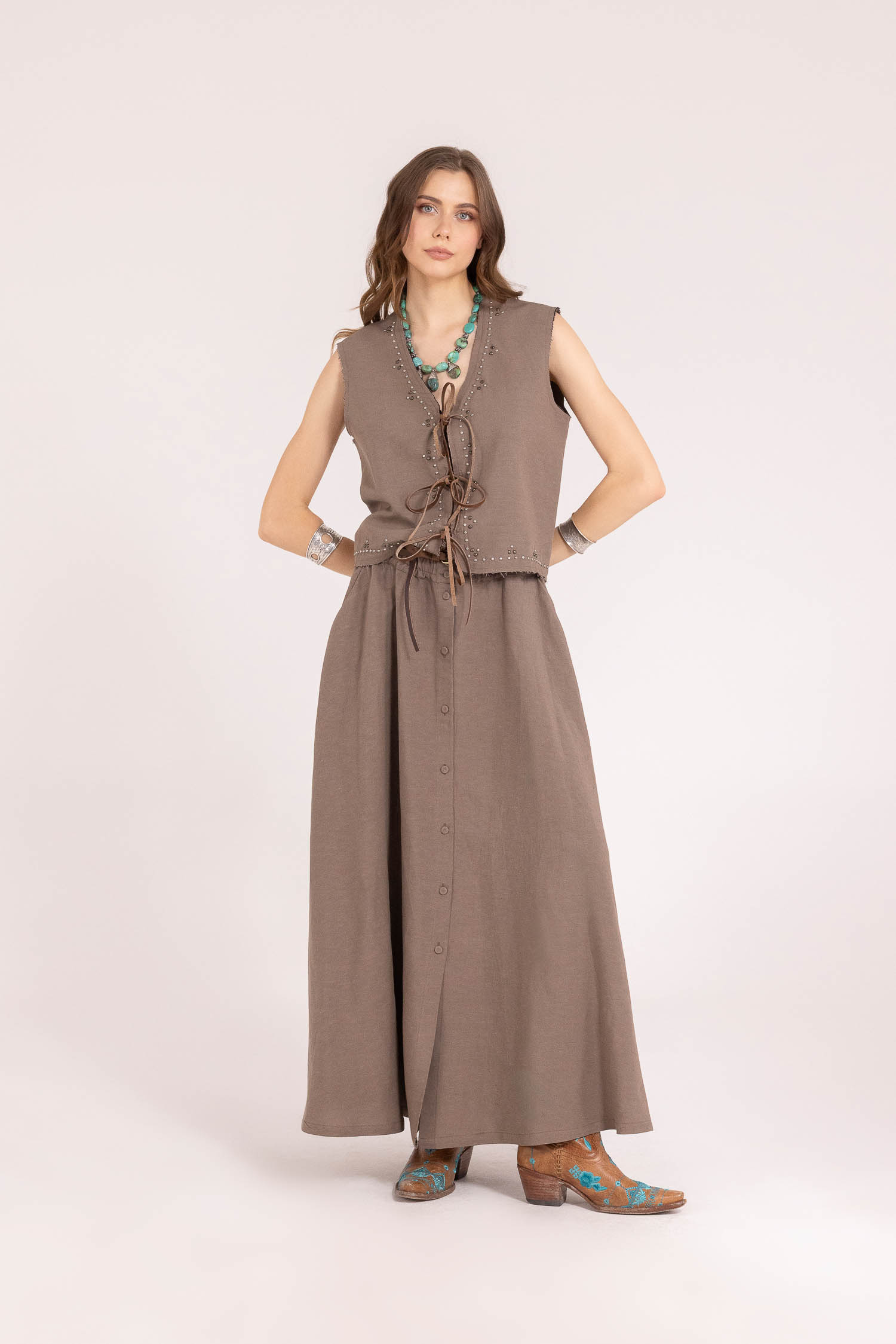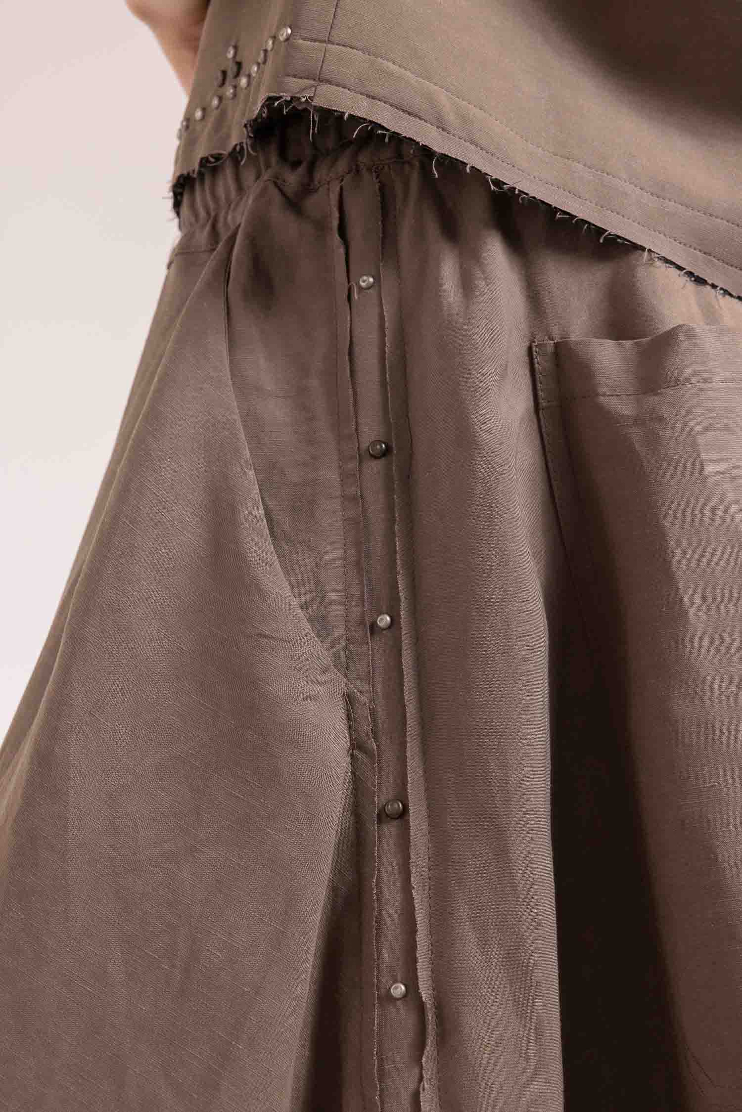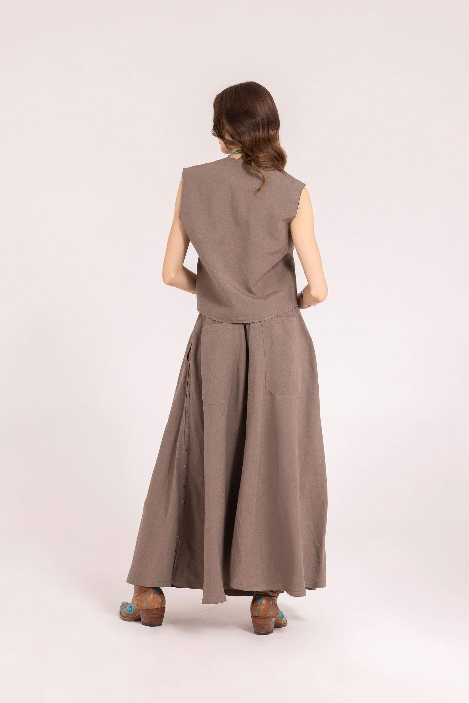 Realizzata in un pregiato blend di 60% viscosa e 40% lino, offre una texture materica e una caduta fluida che accompagna il movimento con naturalezza e presenza.