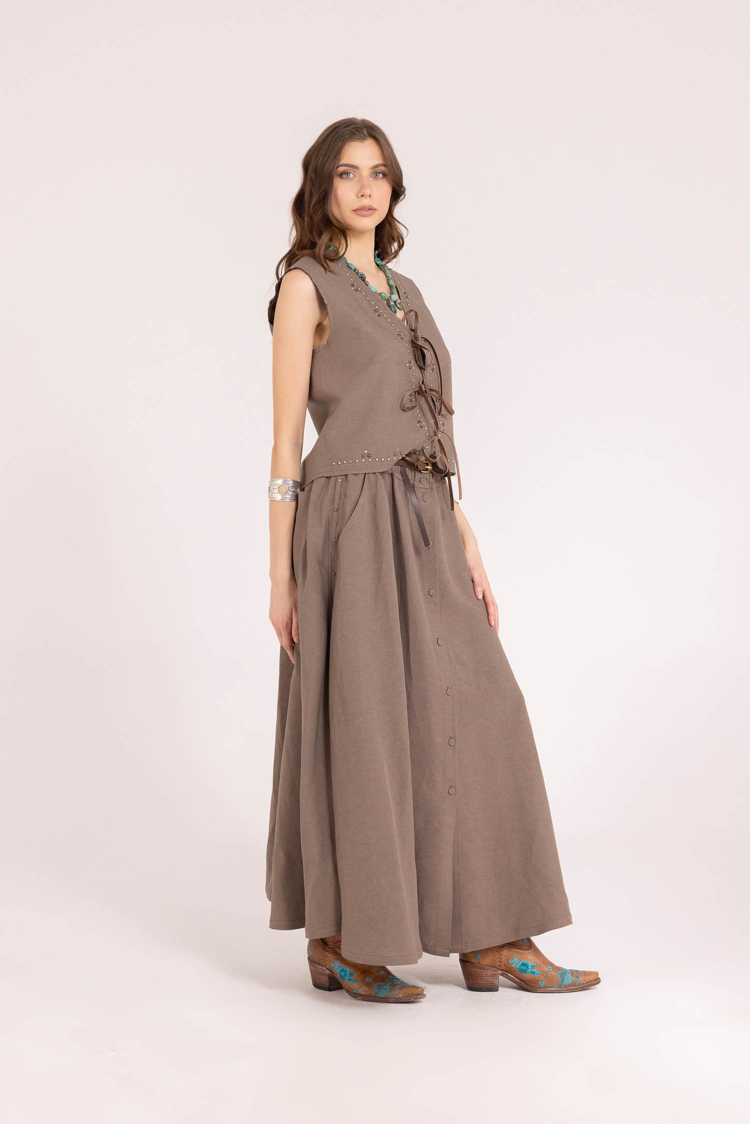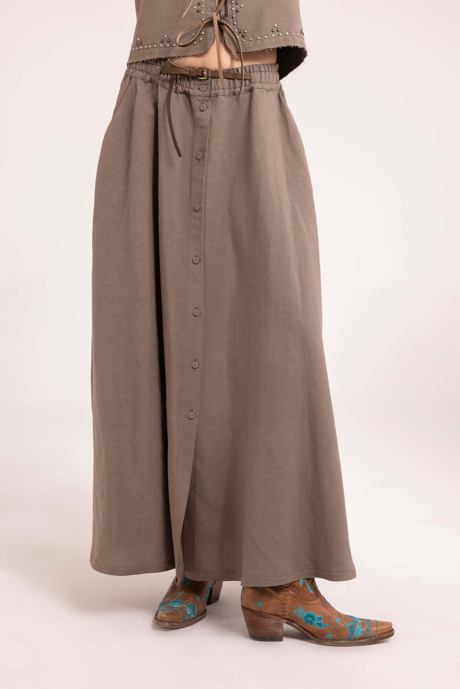 Rigore, materia e carattere si incontrano in una gonna lunga che non passa inosservata. Neo-Artisan di Front Street 8 è un capo scultoreo e contemporaneo, pensato per una femminilità decisa, sofisticata e profondamente autentica.
