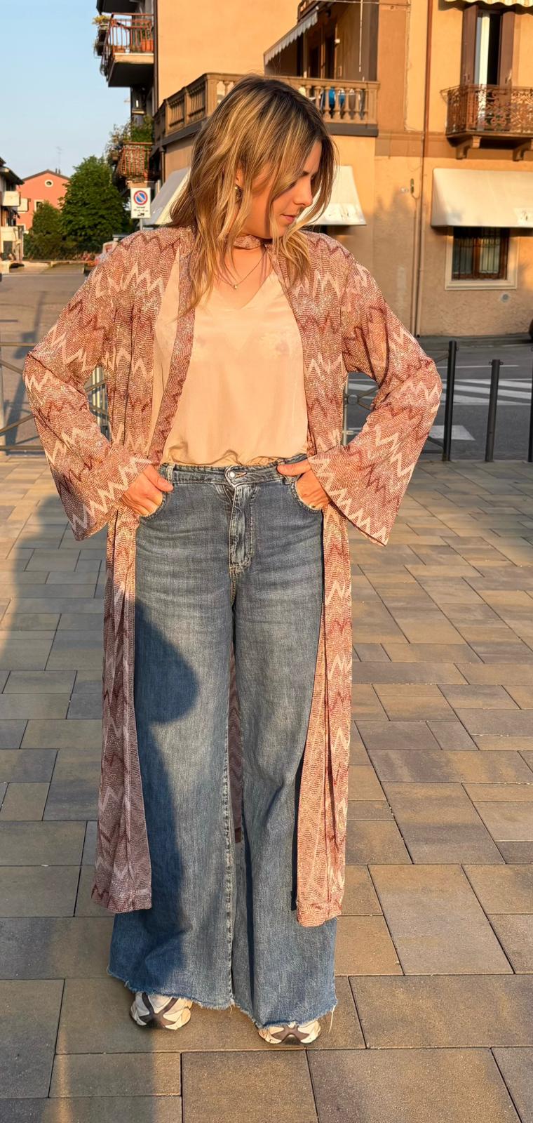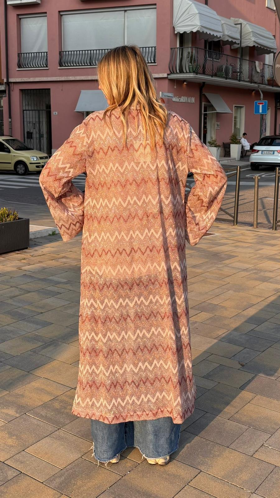 Questo maxi kimono firmato B limousine è uno di quei pezzi che non passano inosservati: fluido, luminoso, avvolgente, con una fantasia zig zag nei toni caldi del rosa, rame e beige, attraversata da delicati fili lurex che catturano la luce ad ogni movimento.