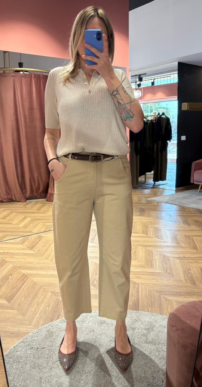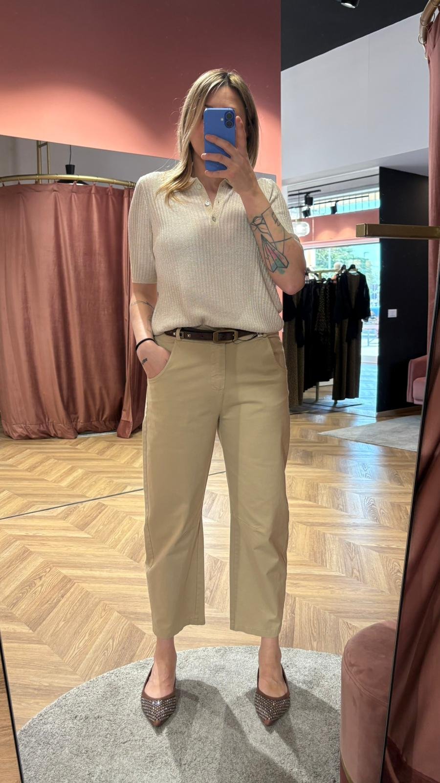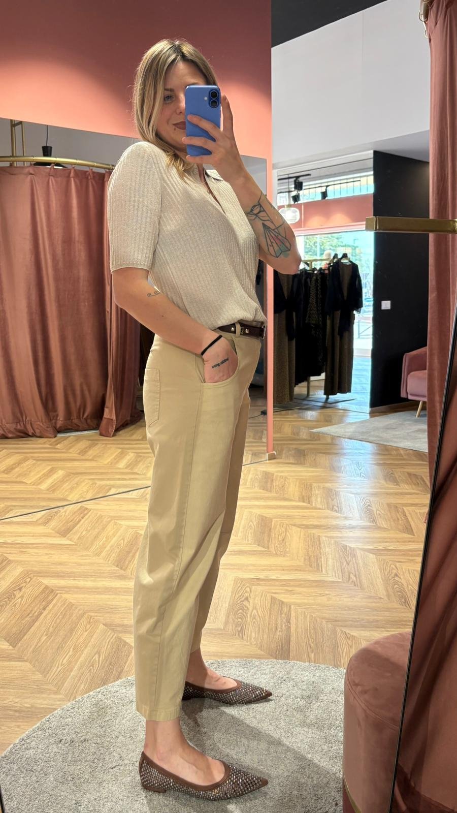 Il colore beige caldo lo rende un capo versatile e raffinato, facile da abbinare a maglie in viscosa, camicie leggere o cardigan per creare look equilibrati e luminosi.