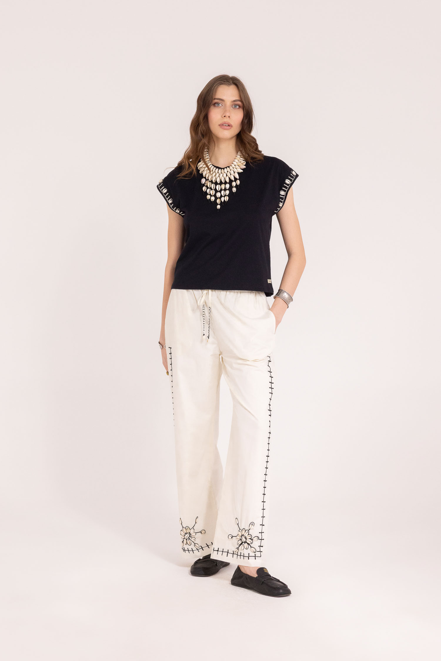Il vero protagonista è il lavoro manuale: conchiglie e ricami applicati a mano, che rendono ogni capo unico e irripetibile.