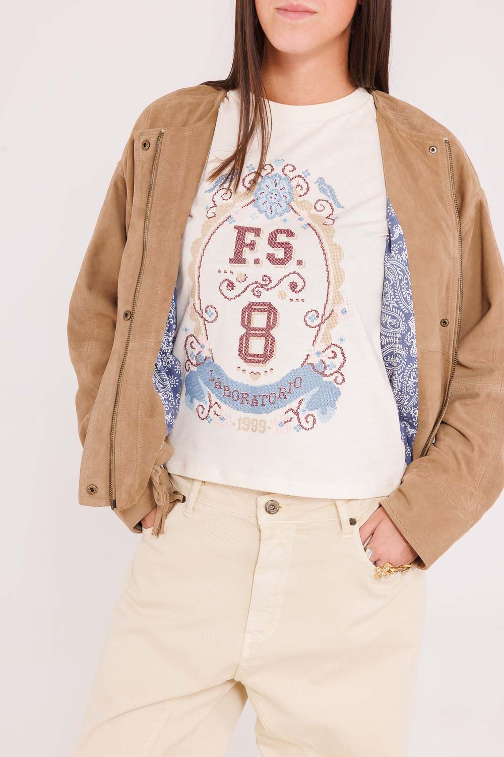Protagonista assoluto è il maxi ricamo “FS Laboratorio” realizzato a punto croce. Una tecnica tradizionale reinterpretata in chiave contemporanea che trasforma la semplicità della t-shirt in un capo ricercato e riconoscibile.