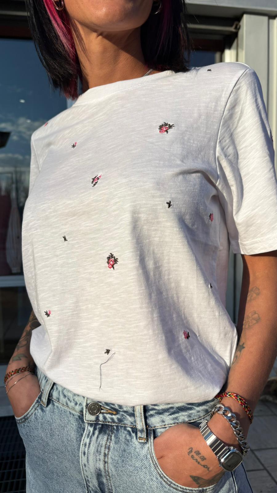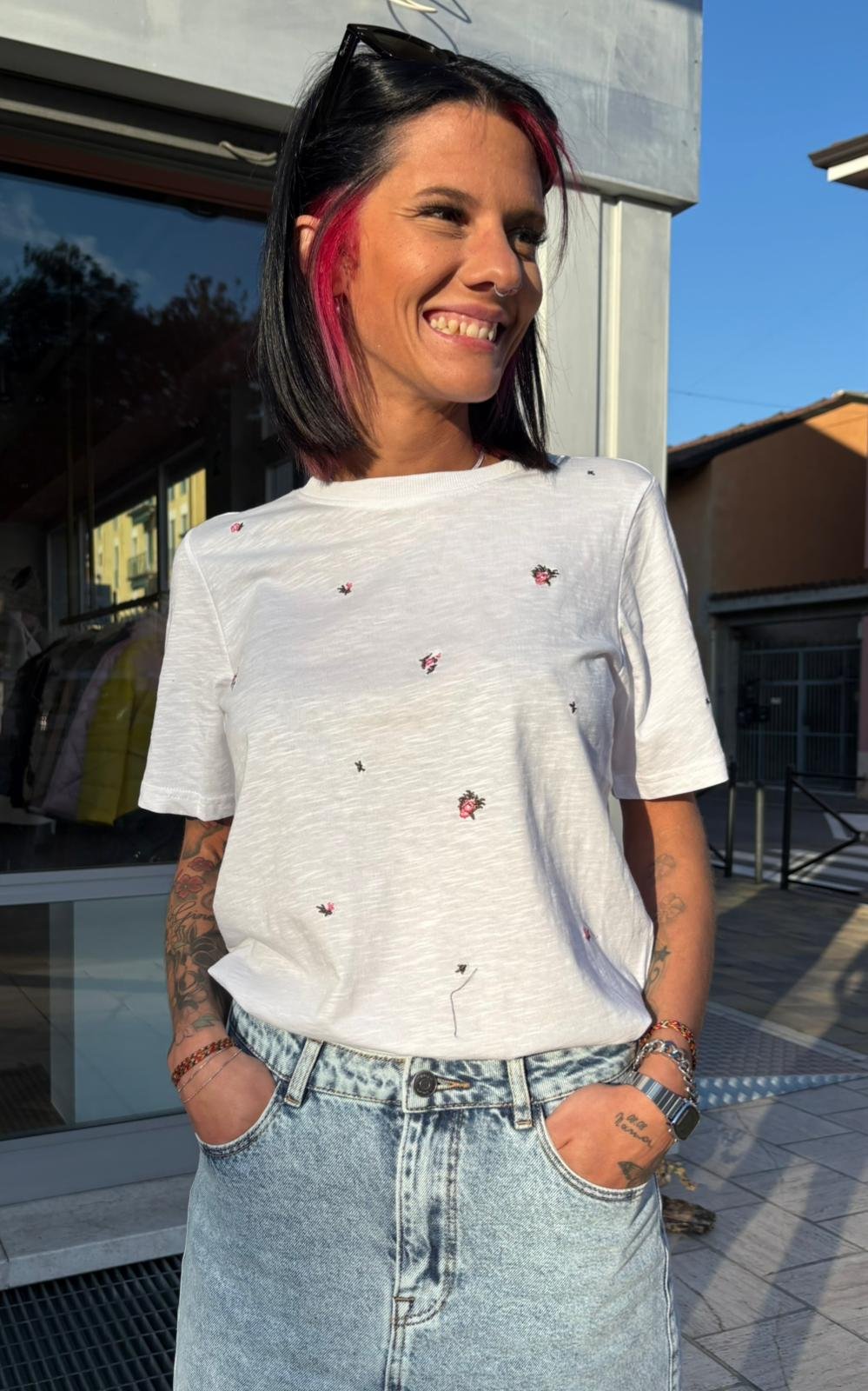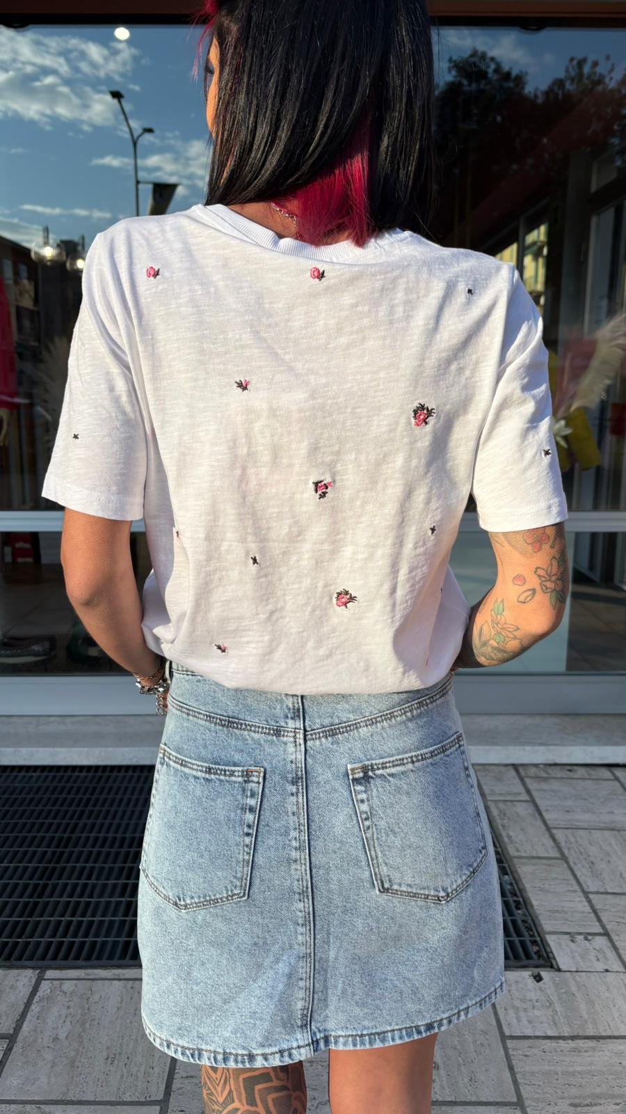 Il design minimal viene impreziosito da delicati ricami a roselline distribuiti su tutta la superficie, piccoli tocchi femminili che rendono questa maglia unica ma facile da abbinare. Il taglio è lineare, con manica corta e girocollo classico, perfetta da indossare sia dentro una gonna in denim sia con un jeans a vita alta.