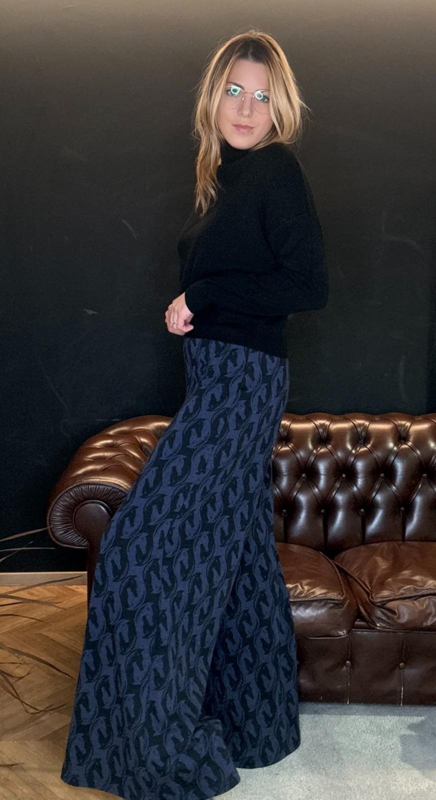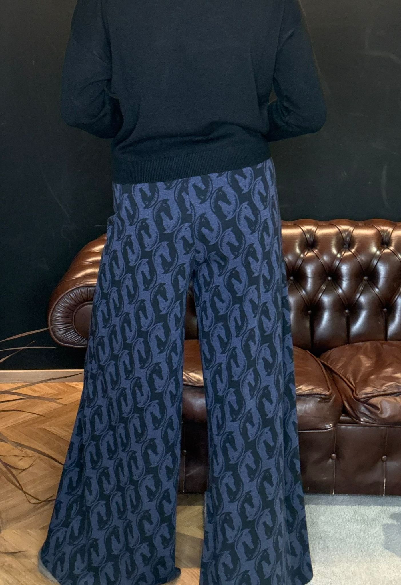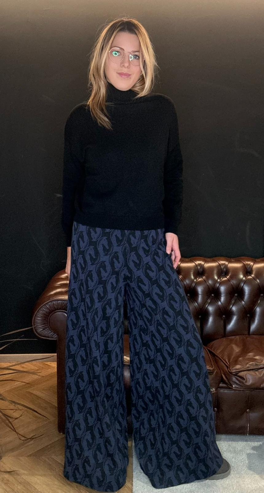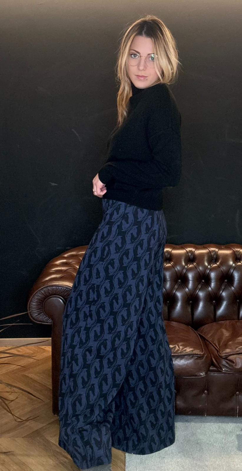 Morbido, fluido e super slanciante, ha una gamba ampia che accompagna il movimento senza mai segnare. La fantasia cavallo nei toni del blu e nero crea un effetto ricercato ma facile da indossare, perfetto per chi vuole un look comodo, zero sbatti e super chic.