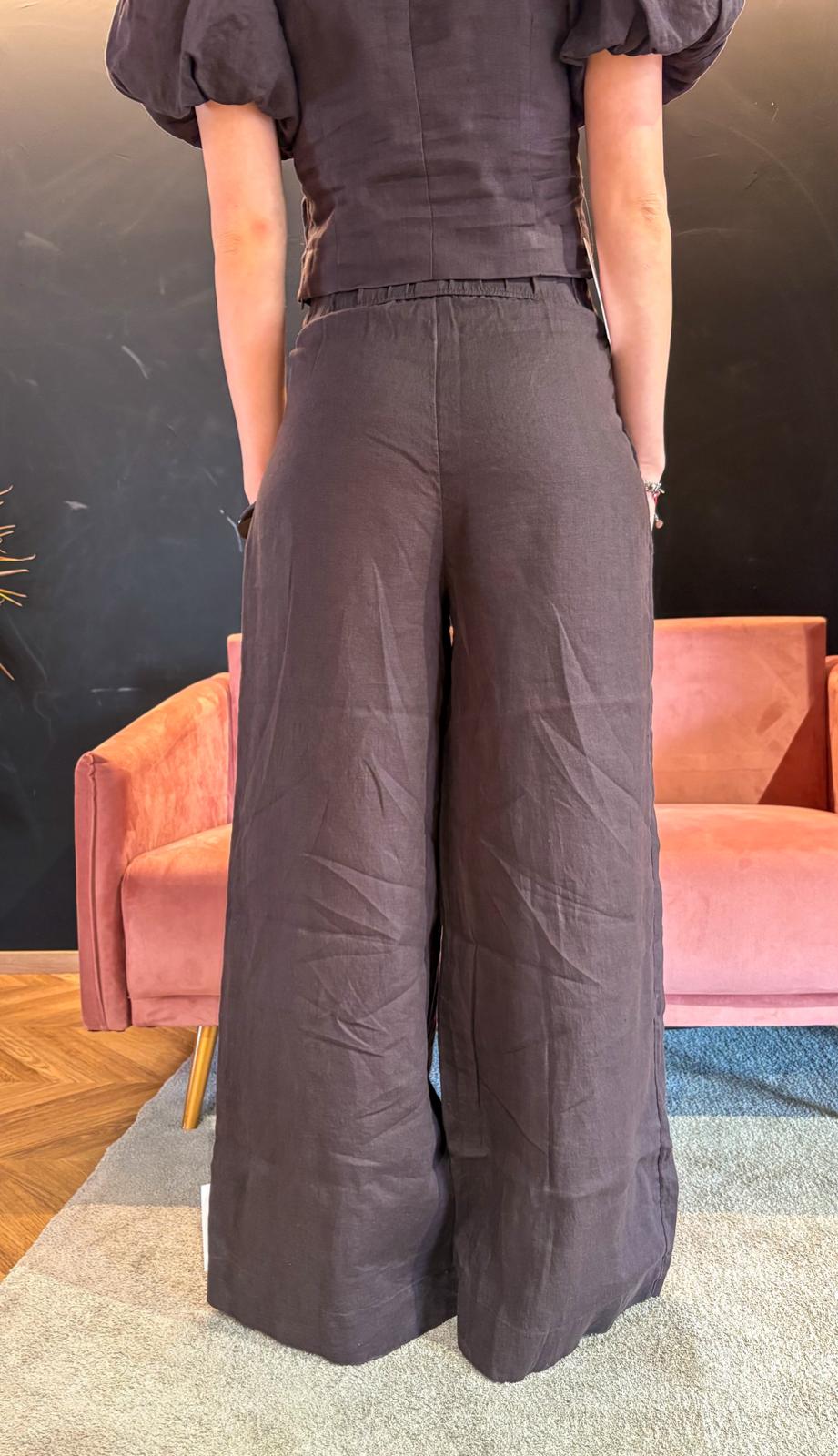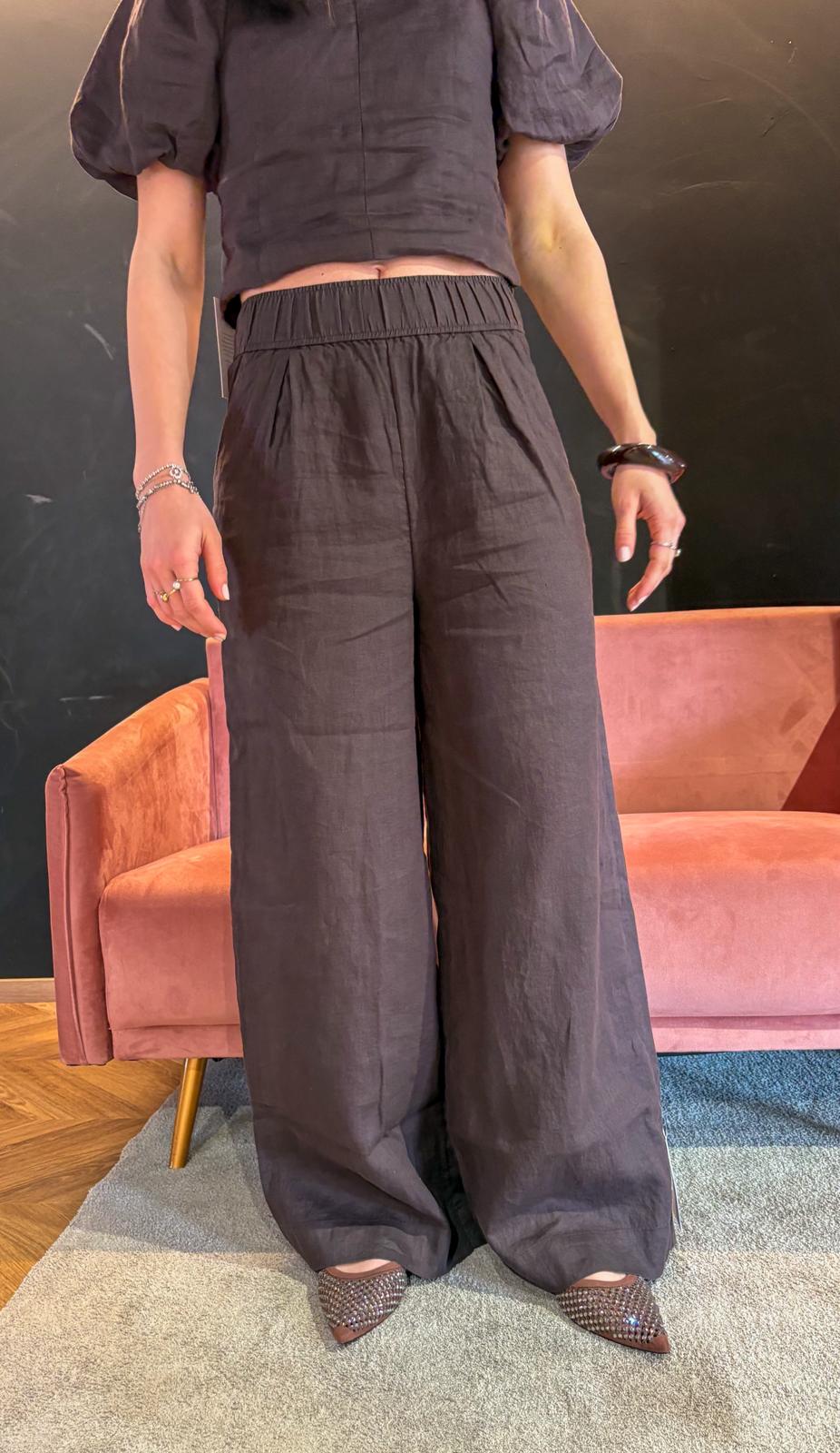 La linea ampia a gamba larga crea movimento e slancia la figura, mentre la vita alta elasticizzata rende la vestibilità comoda e naturale. È il pantalone che si indossa con facilità ma che mantiene un’eleganza rilassata, perfetta dalla mattina alla sera.